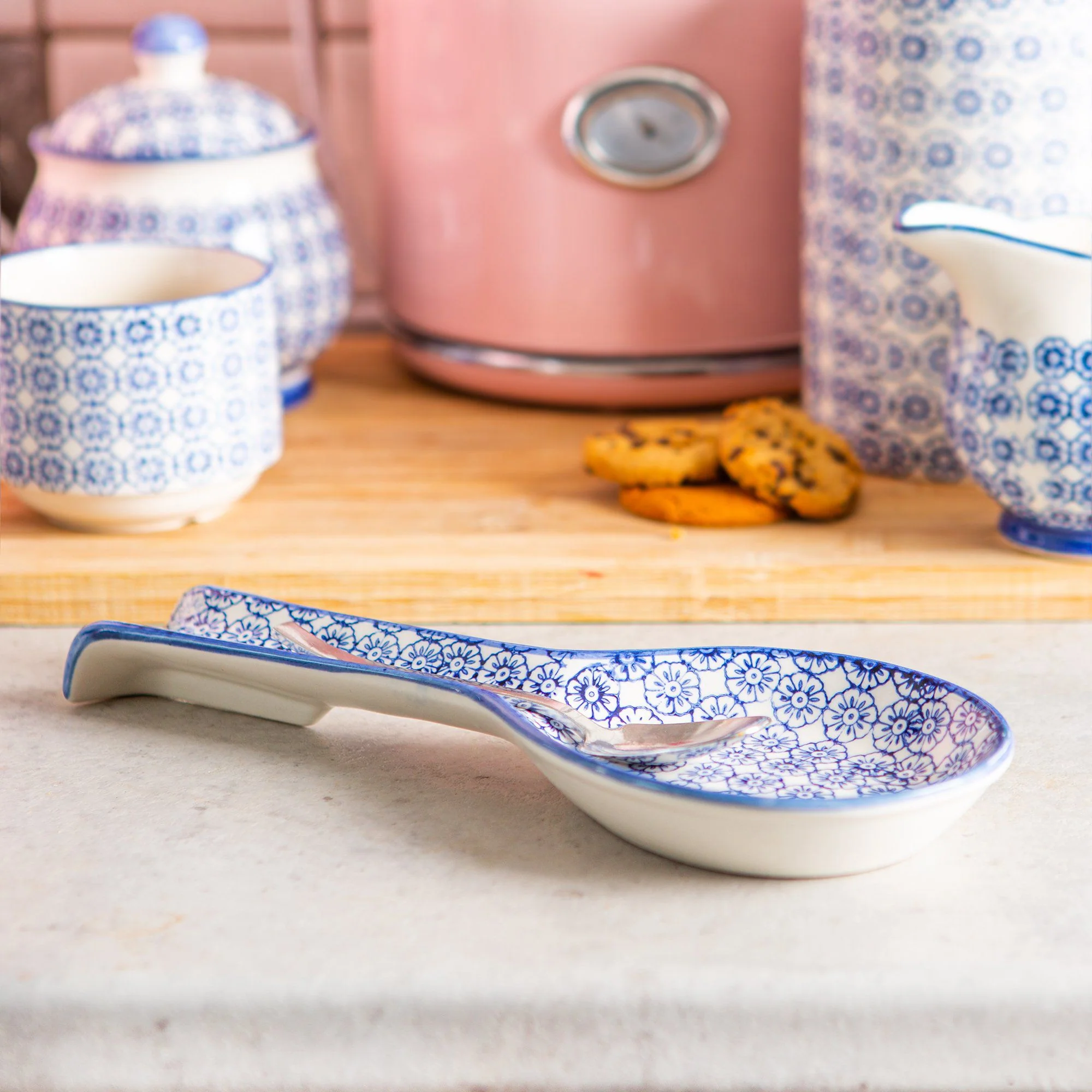 Keep kitchen surfaces free from stains and spillages with this Hand-Printed Floral Patterned China Cooking Spoon and Utensil Rest from Nicola Spring.